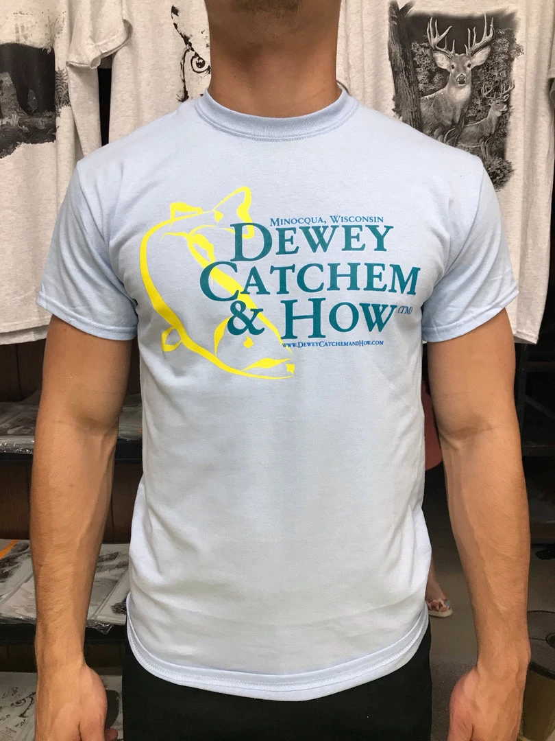 Be the first to review “Dewey Catchem & How Dewey Catchem And How Logo T-shirt Light Blue” Cancel reply