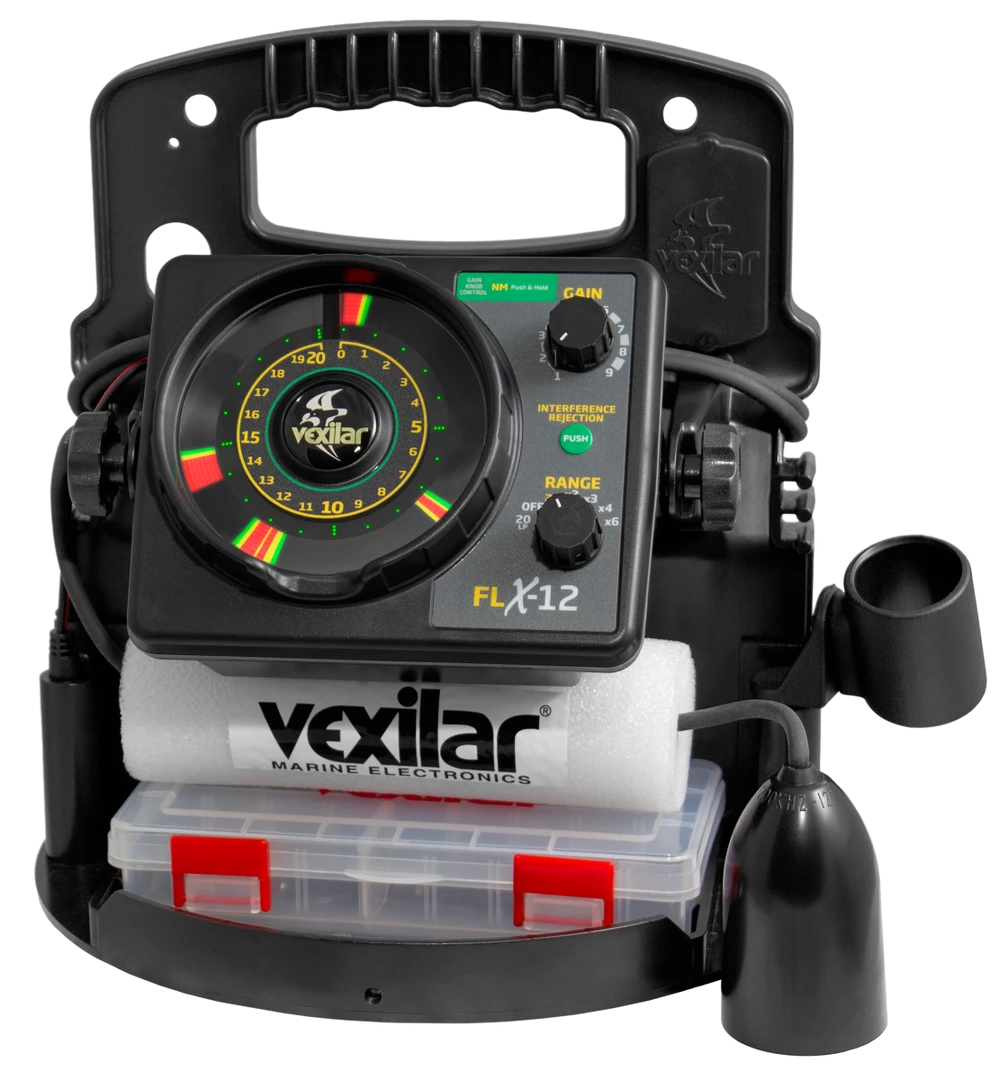 Five depth ranges to 120 feet. It offers a unique night mode option so the display is easier to view at night and also lights up the center depth graphics. There are 20 steps of Interference rejection (IR) to help knock-out interference from other sonar systems. If your battery is running low, the display gives a coded series of flashes long before the unit shuts down. The FLX-12 is VERY popular for open water use as well. When you put the FLX-12 using Vexilar’s Brushless data transfer technology, you get a sunlight readable display with a built in low power mode and ranges to 120 feet. This pack is ready for the ice right out of the package with a 12 degree Ice-Ducer transducer.